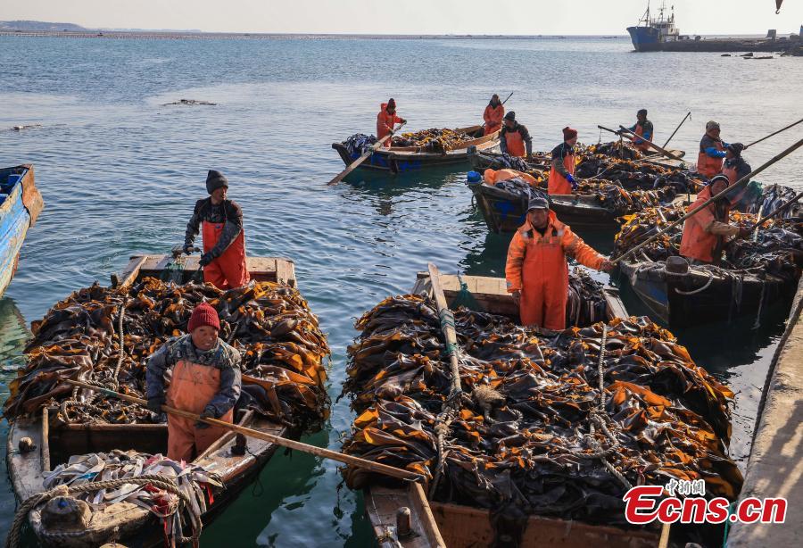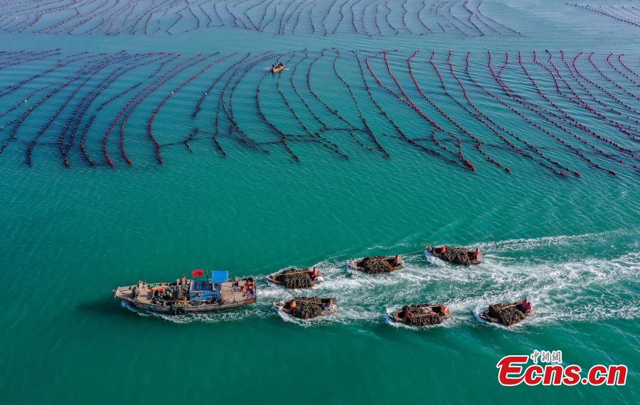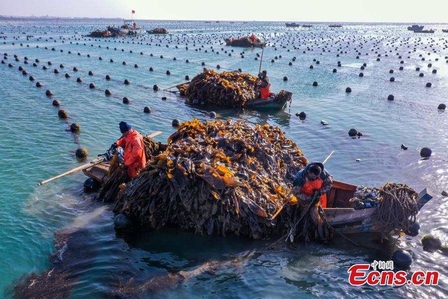 Workers are busy harvesting kelp at a kelp farm in Rongcheng, east China's Shandong Province, March 22, 2021. Rongcheng is the largest kelp production area in China, with an average annual production accounting for 40 percent of the total. (Photo: China News Service/Li Xinjun)