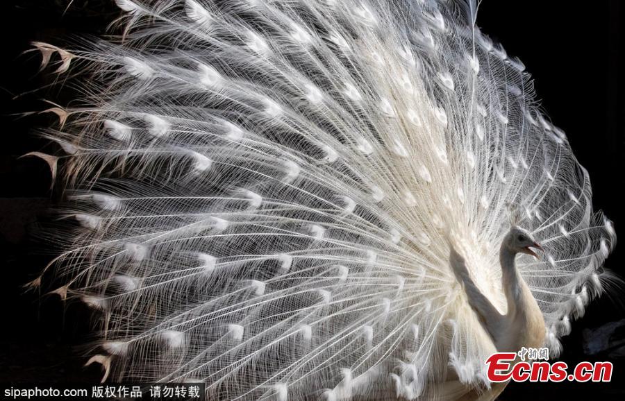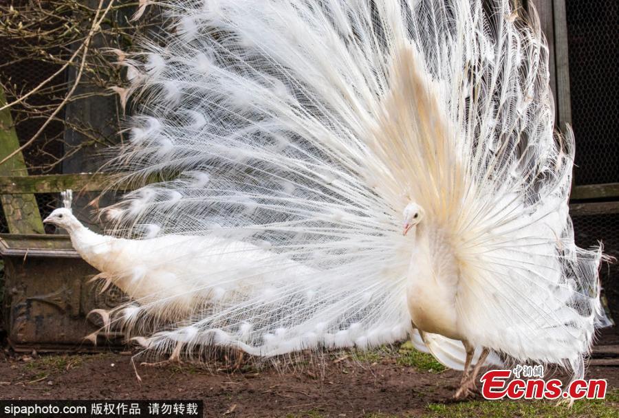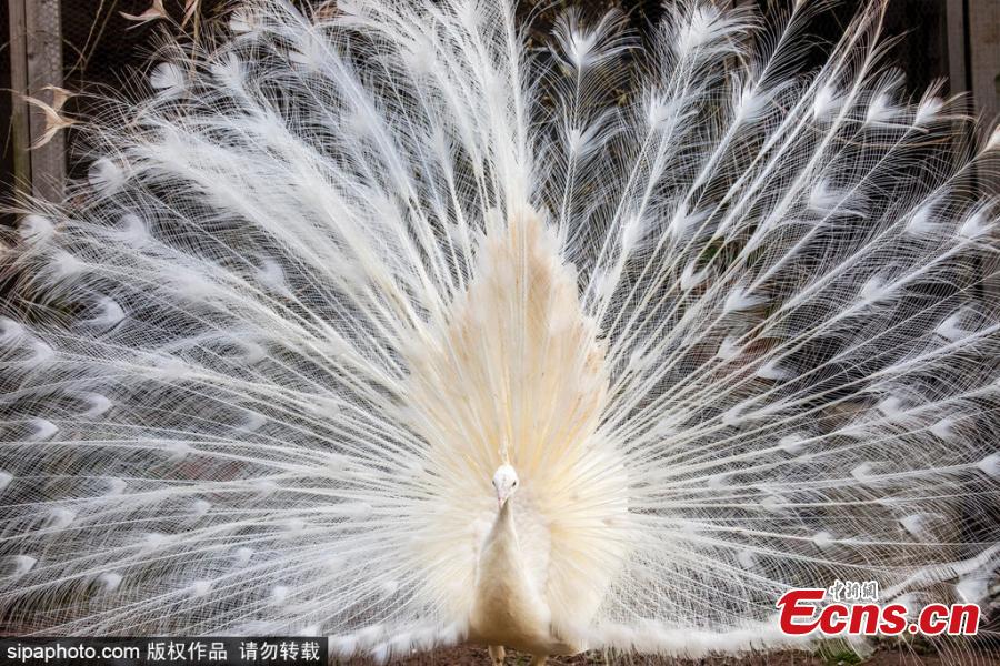 A white peacock shows off his new tail at a bird garden in Oxton,?Scotland, March 22, 2021. The elegant creatures perform their mating rituals with its full plumage on display. (Photo/Sipa)