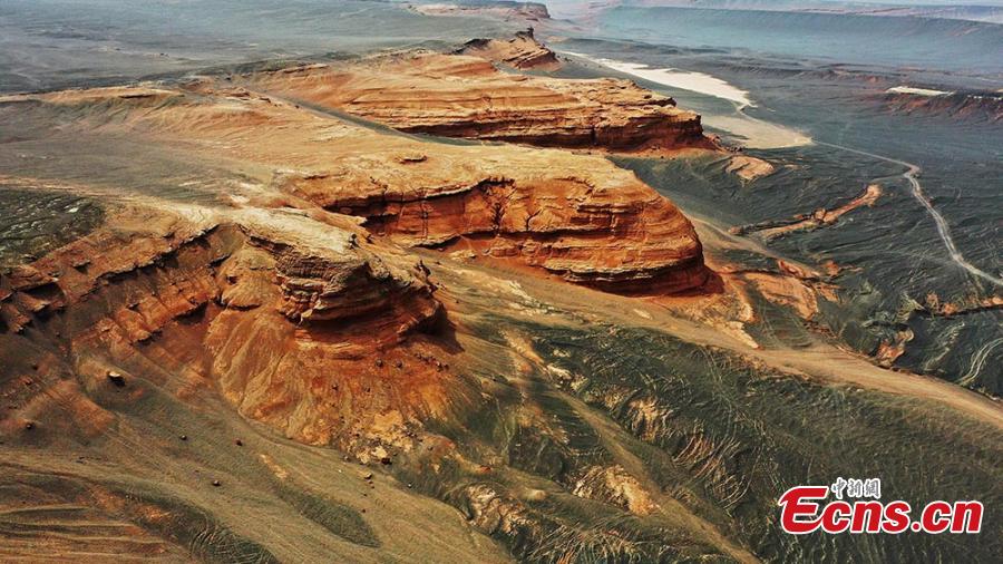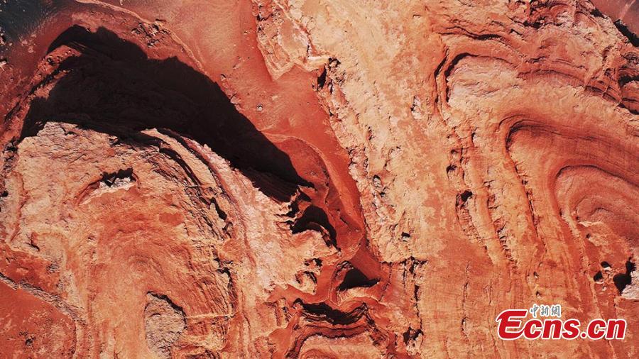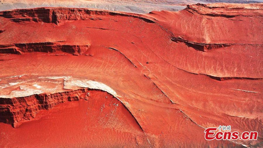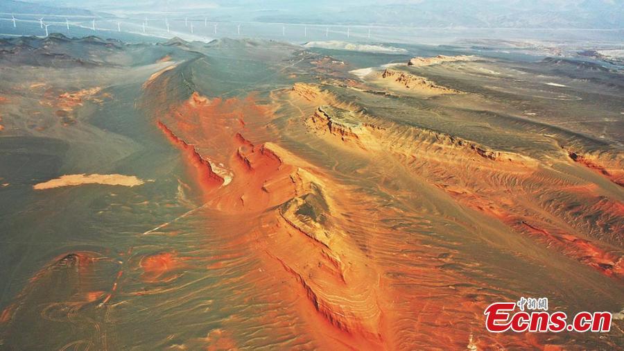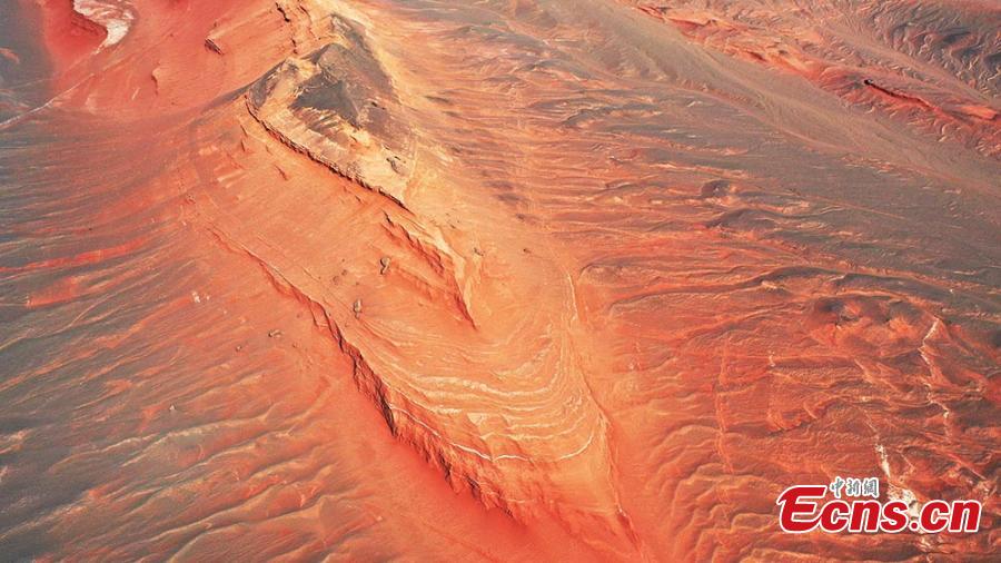 The unique red-colored yardang landform is seen at the foot of Tianshan, Toksun County, China’s Xinjiang Uygur Autonomous Region, March 23, 2021. Yardang landforms are the result of wind erosion and can be found in dry areas, which are formed by many ridges and grooves. (Photo: China News Service/Li Jinghai)