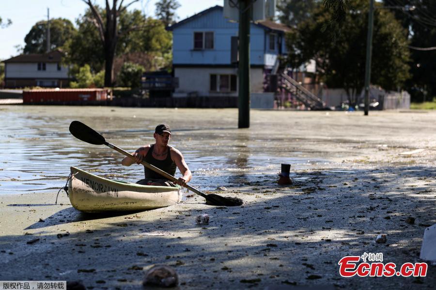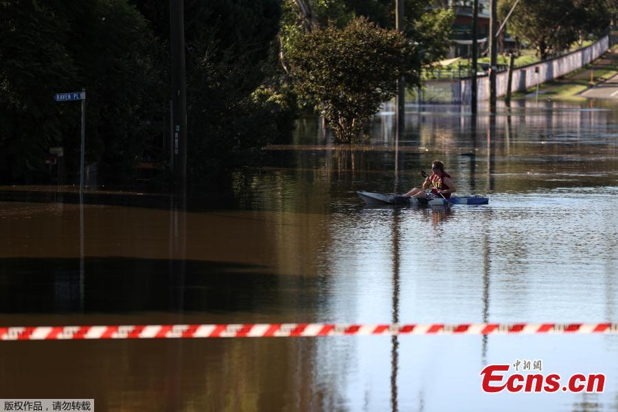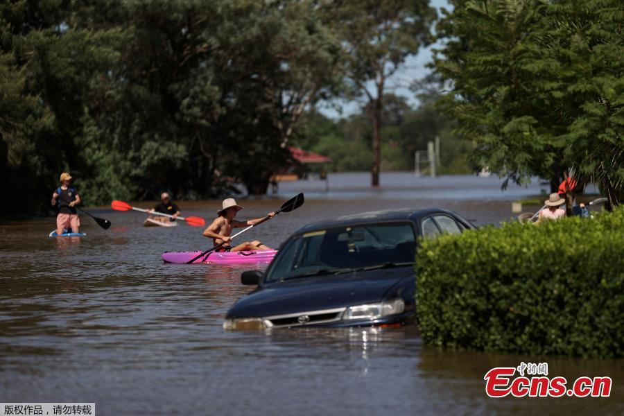 Local residents paddles kayaks at a?flooded residential block in Winsor Town, Sydney, Australia, March 24, 2021. The Australian government has declared a natural disaster in large swaths of New South Wales (NSW) as heavy rains batter the state since Thursday and force thousands to evacuate. (Photo/Agencies)