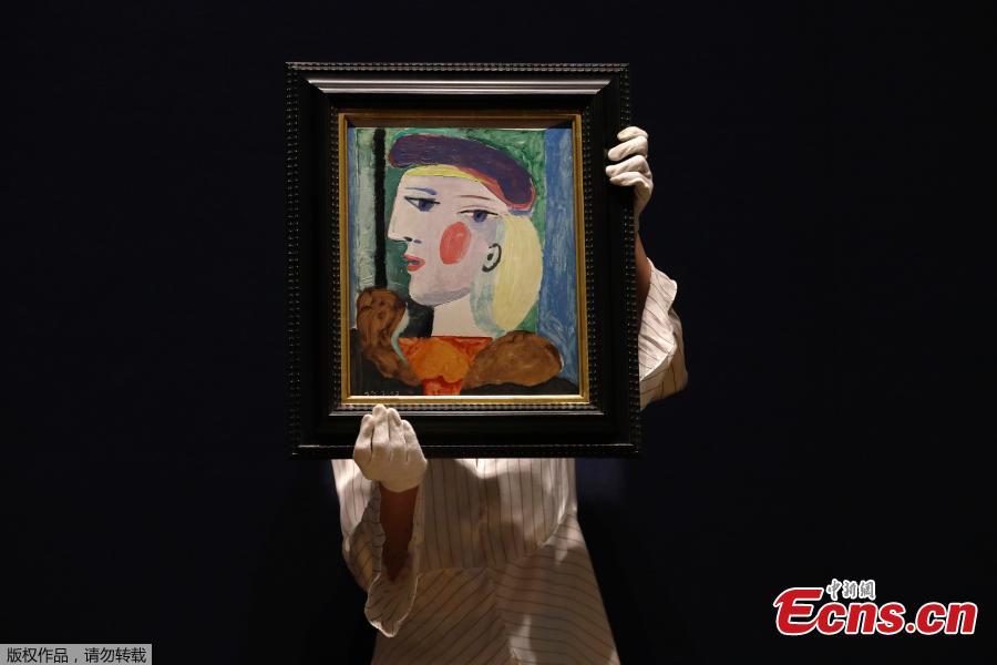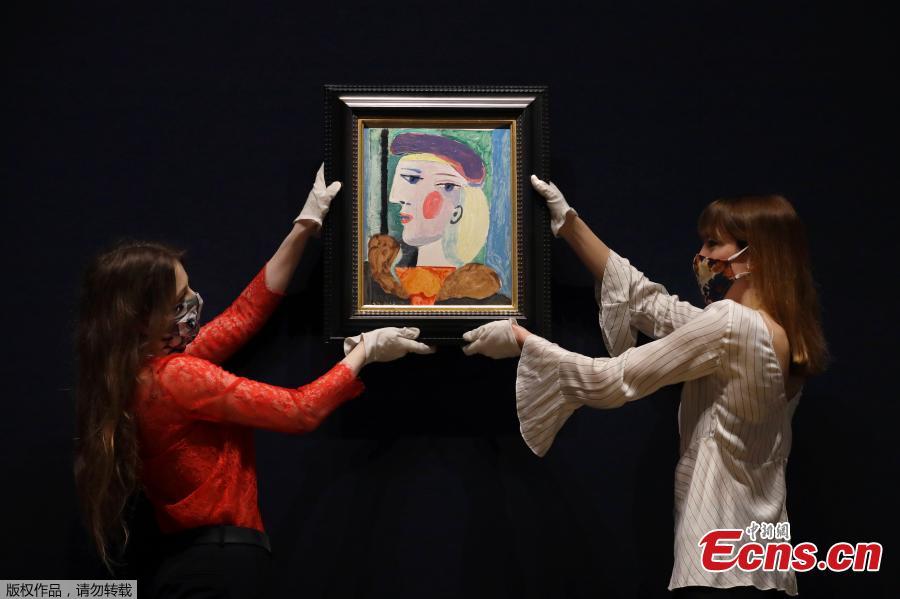 Painting "Femme au béret mauve" by Spanish artist Pablo Picasso is showcased by Bonhams employees in London, March 24, 2021. The painting featuring Marie-Thérèse Walter, one of Picasso's muses, dates back to 1937. It is the same year Picasso also produced Guernica and Weeping Woman, two of his best known works. The portrait has not been displayed in public since 1987 and will be offered for auction in New York due mid-May. (Photo/Agencies)