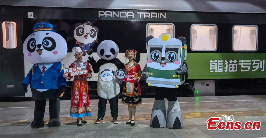 Staff in panda costumes greet passengers at a railway station in Chengdu, capital of southwest China's Sichuan Province, March 28, 2021. China's first panda-themed tourist train "panda train" left Chengdu Railway Station for Zunyi, Guizhou province, on Sunday, kicking off a 3-day spring trip. "Panda Train" features an intelligent service system, music and video entertainment system, restaurant and bar, constant temperature shower system and other user-friendly service facilities. It is a mobile hotel integrating transportation, accommodation, catering, entertainment, conference and other functions. (Photo: China News Service/Liu Zhongjun)