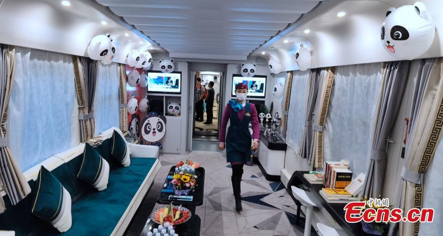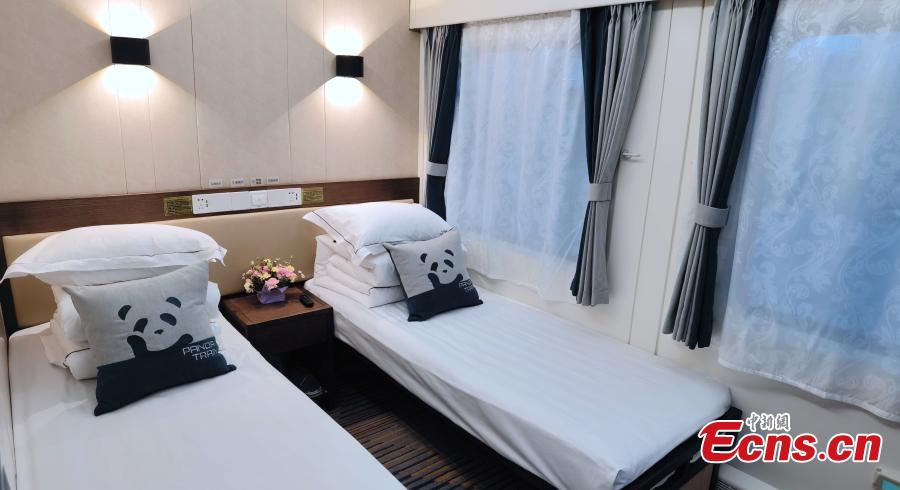 Photo taken on March 28, 2021 shows the deluxe room on the train in Chengdu, southwest China's Sichuan Province. China's first panda-themed tourist train "panda train" left Chengdu Railway Station for Zunyi, Guizhou province, on Sunday, kicking off a 3-day spring trip. "Panda Train" features an intelligent service system, music and video entertainment system, restaurant and bar, constant temperature shower system and other user-friendly service facilities. It is a mobile hotel integrating transportation, accommodation, catering, entertainment, conference