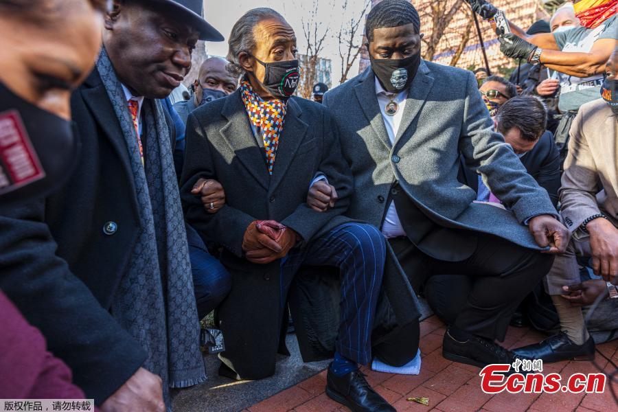 Floyd family lawyer, Attorney Ben Crump (L) and Rev. Al Sharpton, the founder and President of National Action Network,(C) along with George Floyd's family members kneel outside the Hennepin County Government Center on the opening day of the trial of former Minneapolis police officer Derek Chauvin on March 29, 2021 in Minneapolis, Minnesota. George Floyd must receive justice, his family said ahead of opening arguments March 29 in the trial of the white police officer accused of killing the Black man, whose agonizing death ignited protests against racism and police brutality across the United States and around the world. Derek Chauvin, a veteran of the Minneapolis Police Department, faces murder and manslaughter charges for his role in the May 25, 2020 death of the 46-year-old Floyd. (Photo/Agencies)