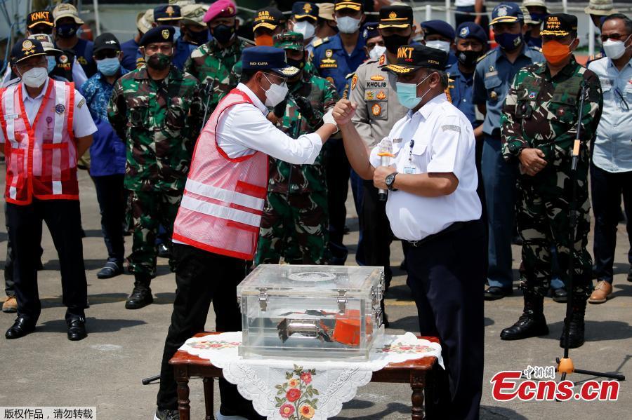 Head of Indonesia's National Transportation Safety Committee (KNKT) Soerjanto Tjahjono greets Indonesia's Transport Minister Budi Karya Sumadi after receiving from him the Cockpit Voice Recorder (CVR) of Sriwijaya Air flight SJ 182, at Tanjung Priok Port in Jakarta, Indonesia, March 31, 2021. (Photo/Agencies)