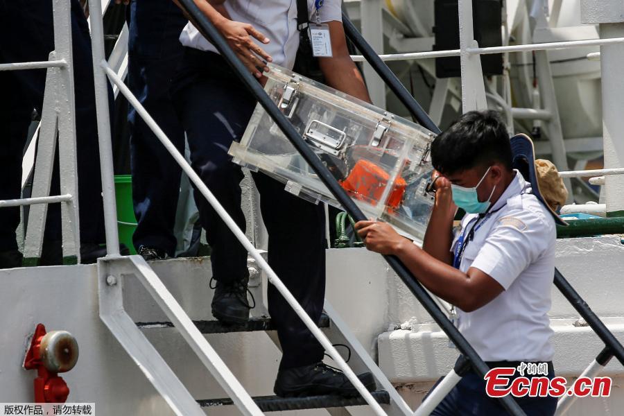National Transportation Safety Committee (KNKT) officials carry the Cockpit Voice Recorder (CVR) of Sriwijaya Air flight SJ 182 down a flight of stairs on an Indonesian Sea And Coast Guard vessel as it arrives at Tanjung Priok Port in Jakarta, Indonesia, March 31, 2021. (Photo/Agencies)