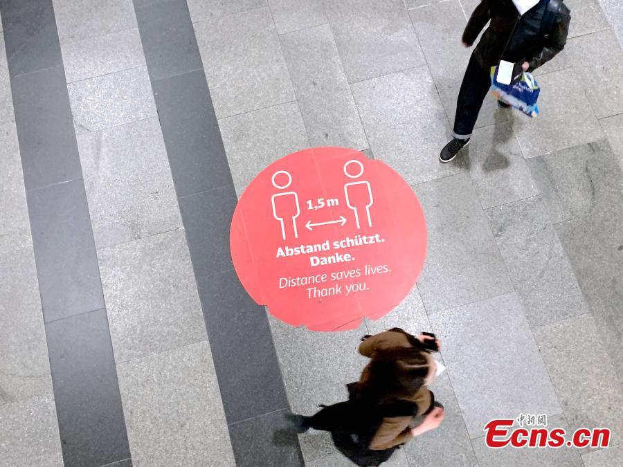 Pedestrians walk past a sign reading "Keep a distance of 1.5 meters" posted on the ground in Berlin, German, April 1, 2021. (Photo: China News Service/Peng Dawei)