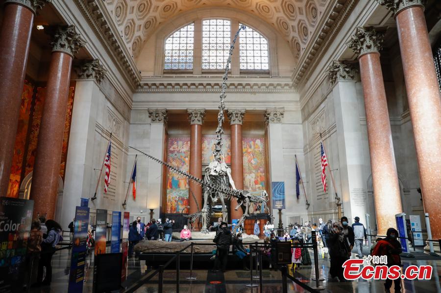 Visitors enter the reception hall of the American Museum of Natural History with online booking vouchers, New York, U.S., April 1, 2021. The museum, which was closed for nearly half a year after the COVID-19 outbreak, has seen a steady increase in daily visitors since it reopened in September last year. (Photo: China News Service/Liao Pan)