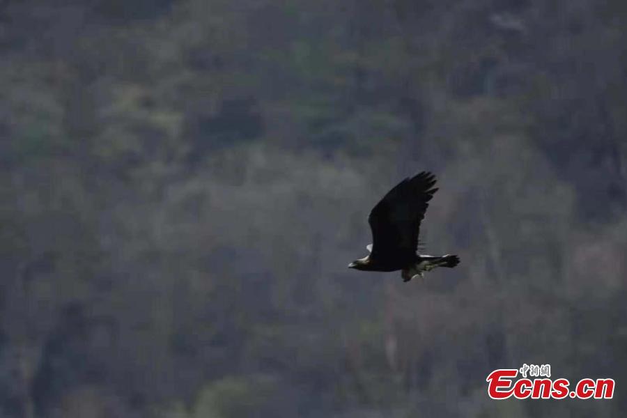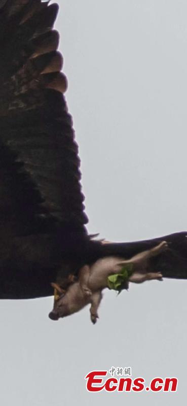 The photo captured by nature photographers who attended an activity in Giant Panda National Park, Guangyuan City, southwest China’s Sichuan Province, shows a golden eagle (Aquila chrysaetos) under first-class state protection in China, carrying a wild pig off into the sky. (Photo by Yao Xinyu/Provided to China News Service)