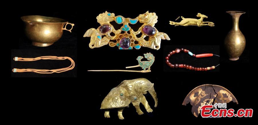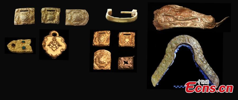 Provided photo shows Gold wares unearthed from the Reshui graveyard site, Dulan county, Haixi Mongolian-Tibetan autonomous prefecture, Qinghai province.