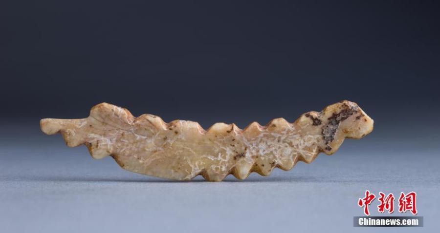 A jade sculpture of a silkworm unearthed from the Shuanghuaishu heritage site. (China News Service/Wang Yi)