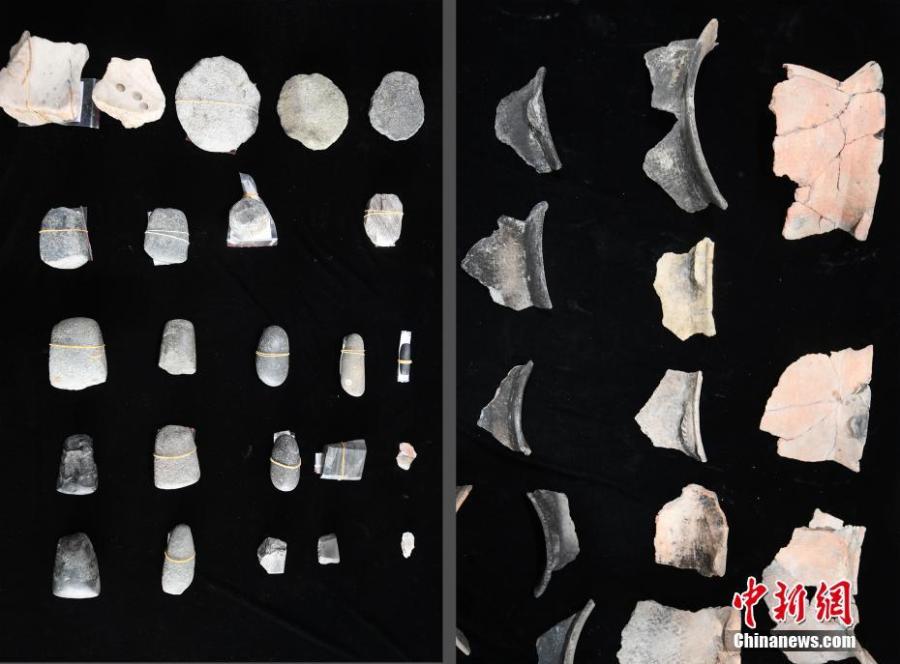 Some stone implements and fragments of pottery cookers found at the Jingtoushan shell mound site. (China News Service/Wang Gang)