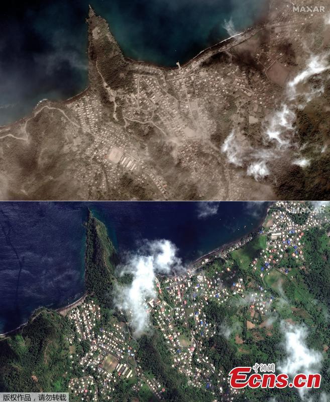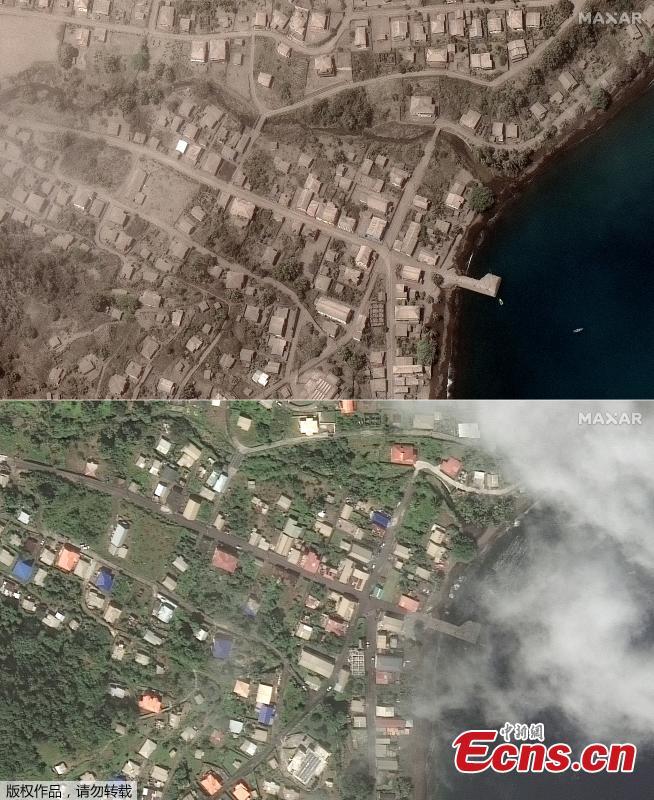 This April 13, 2021, combination of satellite pictures courtesy of MAXAR shows the Richmond Vale waterfront in Saint Vincent covered in volcanic ash (top) on April 13, 2021, and before the eruption on April 2, 2021. (Photo/Agencies)