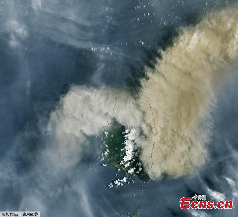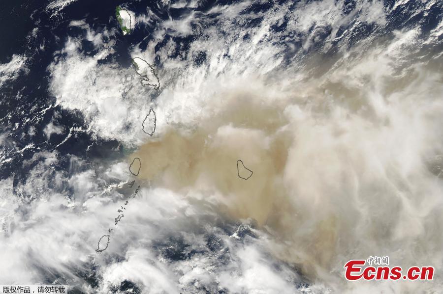 This NASA Earth Observatory handout image obtained April 13, 2021 shows an image captured by the Moderate Resolution Imaging Spectroradiometer (MODIS) of the volcano eruption of the La Soufriere Volcano, as winds carry much of the ash and gas east from Saint Vincent, reaching Barbados, 190 kilometers (120 miles) away on April 10, 2021. (Photo/Agencies)