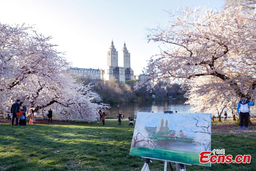 People enjoy the spring scenery in Central Park in New York, the U.S., April 13, 2021. (Photo: China News Service/Liao Pan)