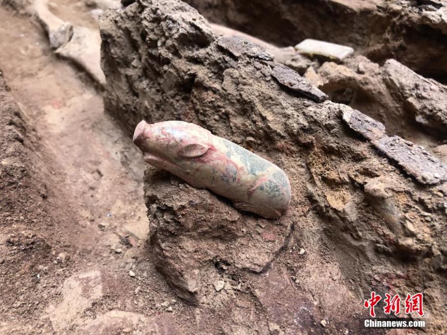 The photo shows a jade artifact unearthed from Dabaozi Cemetery, northwest China’s Shaanxi Province. (Photo/Provided to China News Service by Shaanxi Academic of Archaeology)