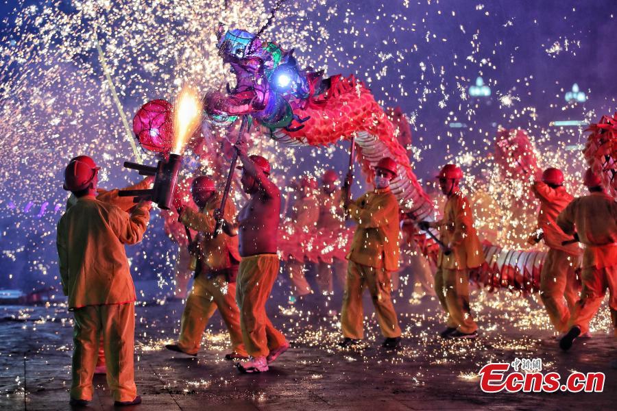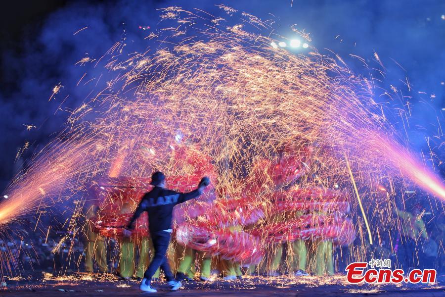 People hold a fire dragon dance to celebrate the Miao Sisters Festival at Taijiang County, Qiandongnan Miao and Dong Autonomous Prefecture, Guizhou Province, April 25. The dance is a Miao tradition in Taijiang County. Dragon dancers perform shirtless in the firelight, creating a spectacular scene. The dance is known as "the game of the brave".(Photo: China News Service/Qu Honglun)