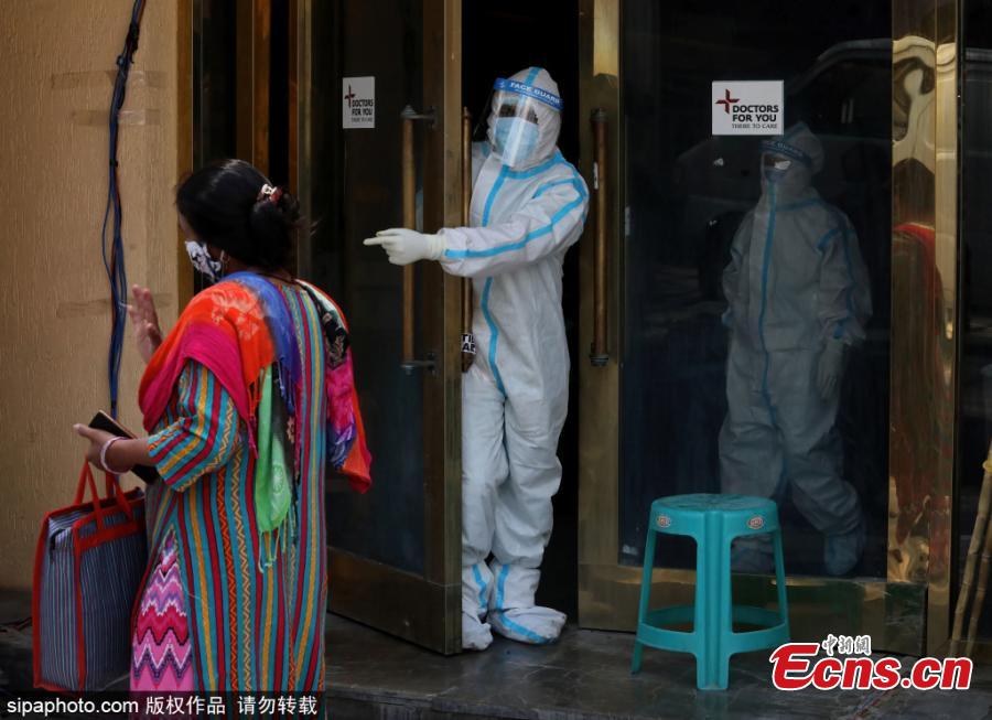 A healthcare worker in personal protective equipment (PPE) talks with a family member of a COVID-19 patient who was admitted to the COVID-19 isolation ward. A banquet hall temporarily converted to a COVID-19 ward for coronavirus patients. India has recorded the highest single-day spike in coronavirus infection. The report recorded 352,991 new COVID-19 cases and 2,812 people deaths in the last 24 hours amid an oxygen crisis. (Photo/Sipaphoto)