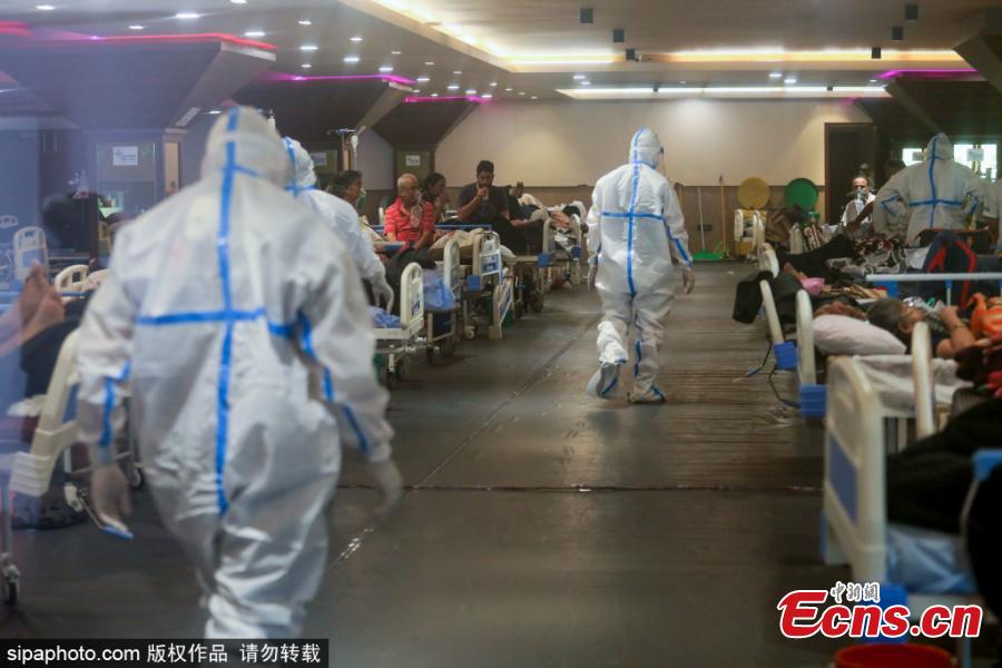 Healthcare workers in personal protective equipment (PPE) walk in the COVID-19 isolation ward. A banquet hall temporarily converted to a COVID-19 ward for coronavirus patients. India has recorded the highest single-day spike in coronavirus infection. The report recorded 352,991 new COVID-19 cases and 2,812 people deaths in the last 24 hours amid an oxygen crisis. (Photo/Sipaphoto)