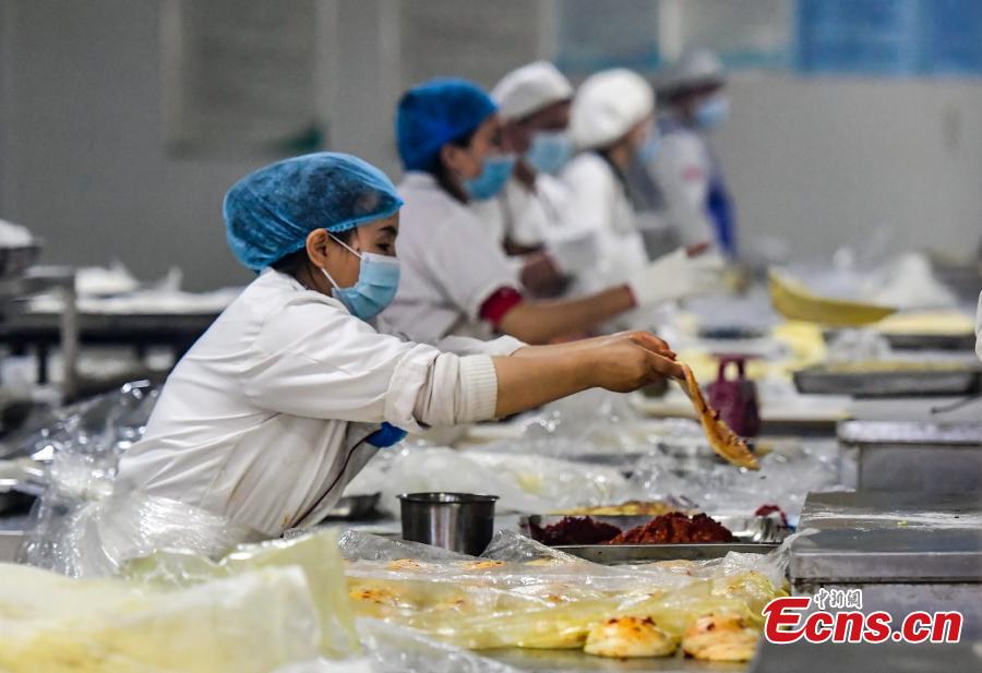Workers make Nang, a kind of crusty pancake of Uygur people, in the Nang Cultural Industrial Park (Phase I) in Urumqi, Xinjiang Uygur Autonomous Region, April 27, 2021. (Photo: China News Service/Liu Xin)