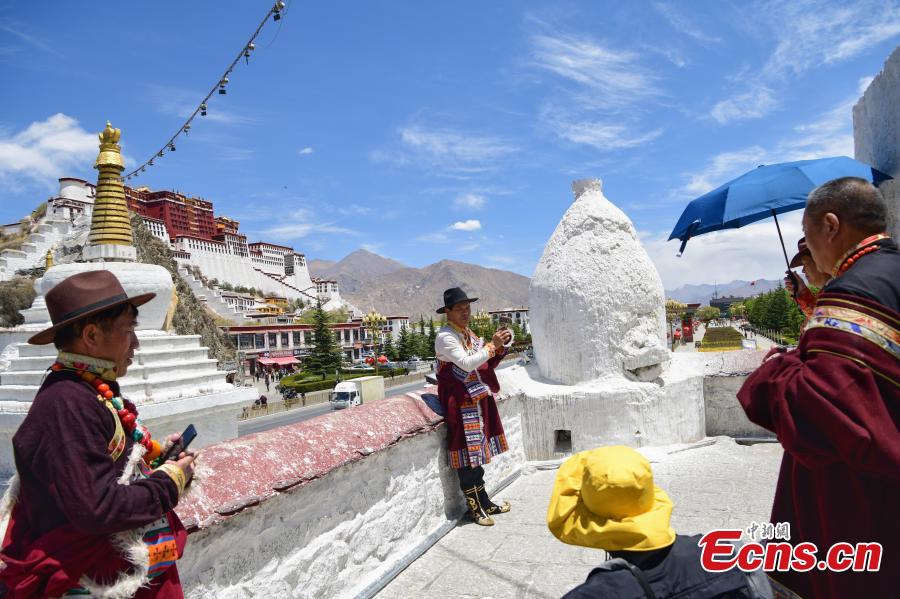 Photo taken on April 29, 2021 shows the Potala Palace in Lhasa, capital of southwest China's Tibet Autonomous Region. Tourists in traditional Tibetan costumes were seen at the Potala Palace and Barkhor Street in Lhasa. Tourism in Tibet will witness a notable boom in the upcoming May Day holiday from May 1 to 5. (Photo: China News Service/Gongga Laisong)