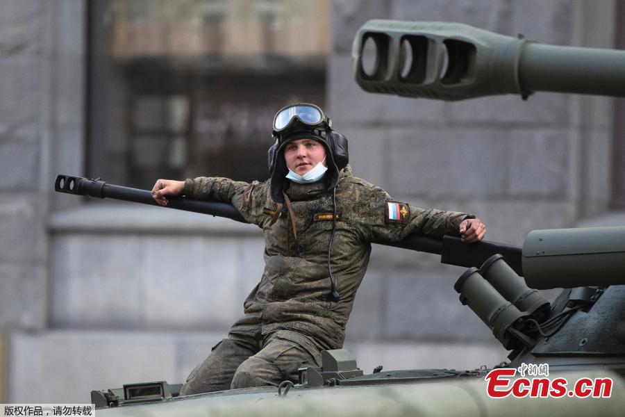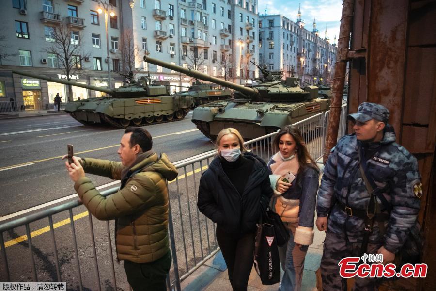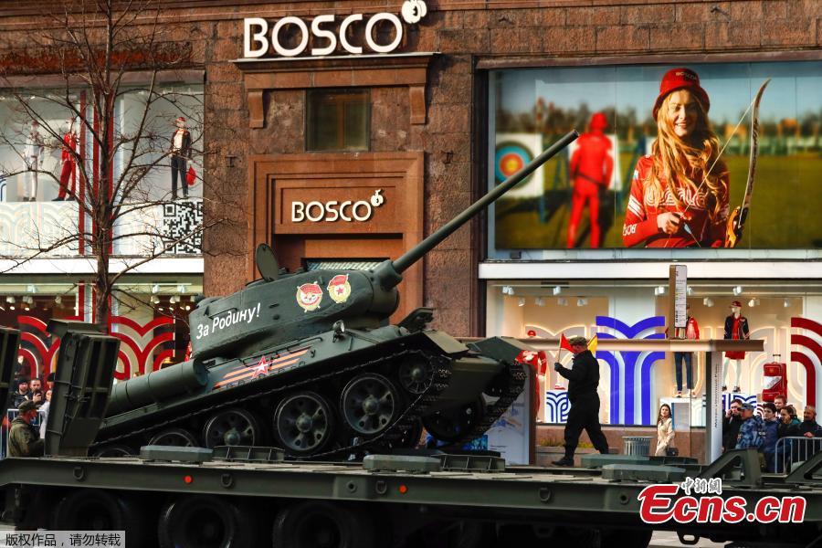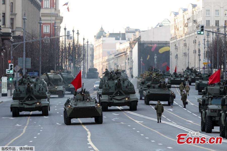 Military hardware drive down the street during a rehearsal of the military parade marking the 76th anniversary of the victory over Nazi Germany in World War II in Moscow, Russia, April 29, 2021. (Photo/Agencies)