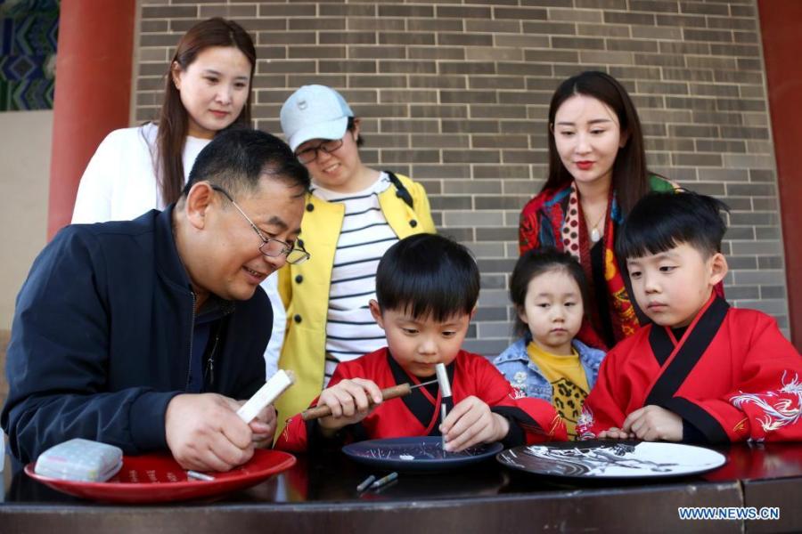 Children learn the technique of porcelain carving in Mengzhuang Town of Zaozhuang City, east China's Shandong Province, May 1, 2021. Official data showed 230 million domestic tourist trips were made during the five-day Labor Day holiday, up 119.7 percent from last year. (Photo by Sun Zhongzhe/Xinhua)