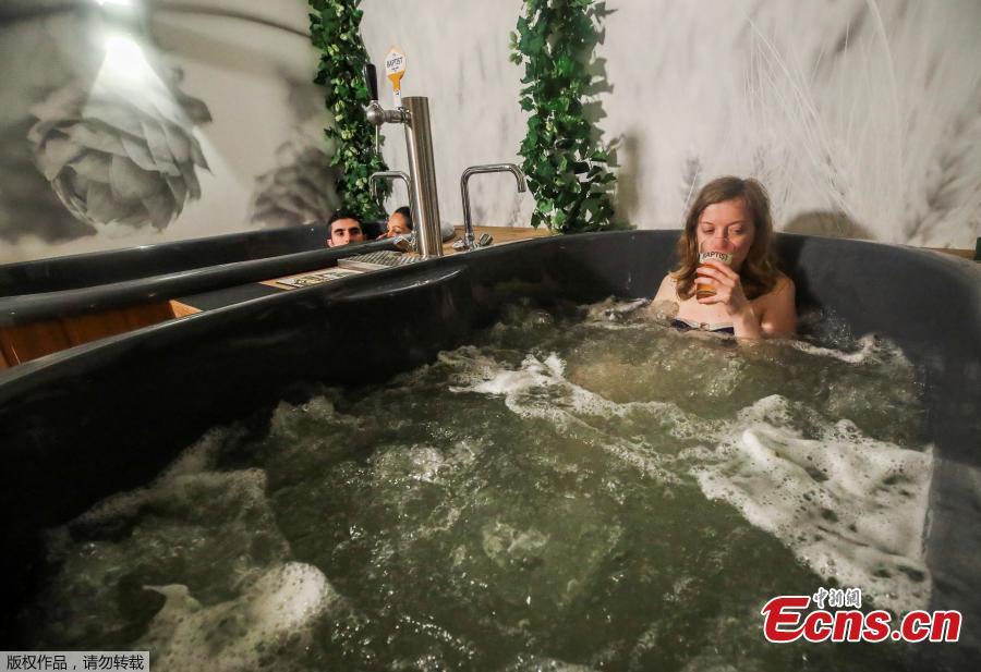Belgian yoga teacher Dorien Dierckx, 29 from Brussels enjoys a beer while relaxing in a jacuzzi full of hot water and a mixture of ingredients used to make beer, and where customers can serve their own beer from the tap at the Good Beer Spa in Brussels, Belgium May 12, 2021.(Photo/Agencies)
