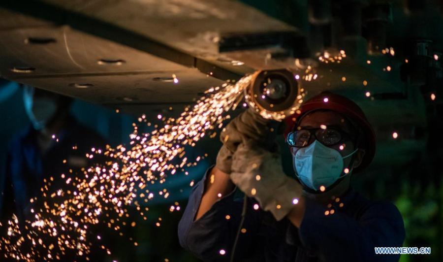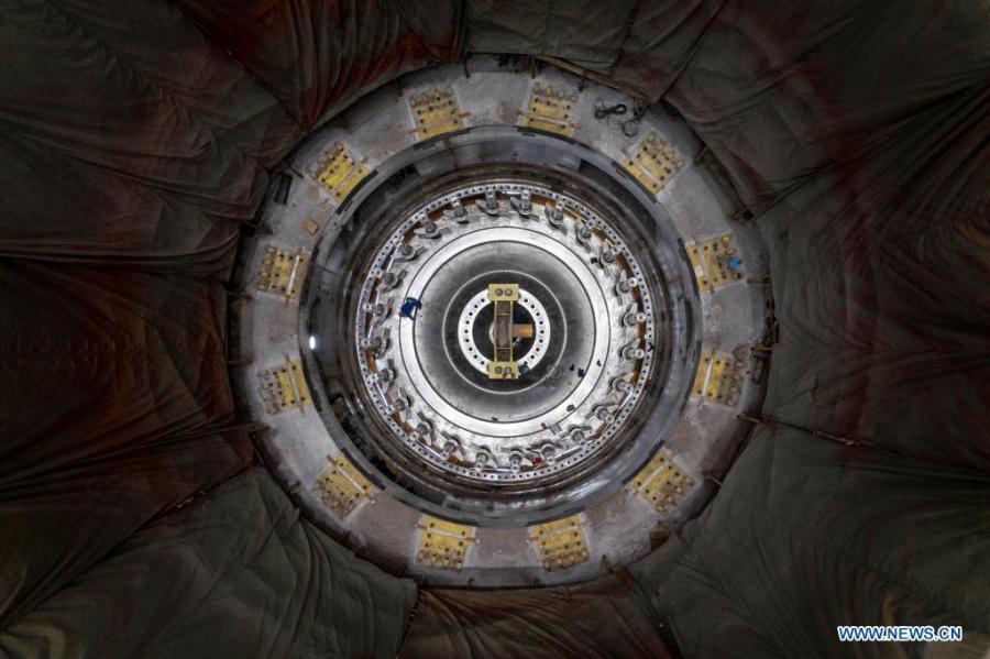 Aerial photo taken on May 14, 2021 shows workers installing generating units at the construction site of the Baihetan hydropower station in southwest China. Baihetan on the Jinsha River, the upper section of the Yangtze, straddles the southwest provinces of Yunnan and Sichuan. With a total installed capacity of 16 million kilowatts, it is the second-largest hydropower station in China in terms of installed capacity, second only to the Three Gorges Dam project in the central province of Hubei. The first batch of Baihetan's generating units will go into operation in July 2021, and all units are expected to be operational by July 2022. (Xinhua/Jiang Wenyao)