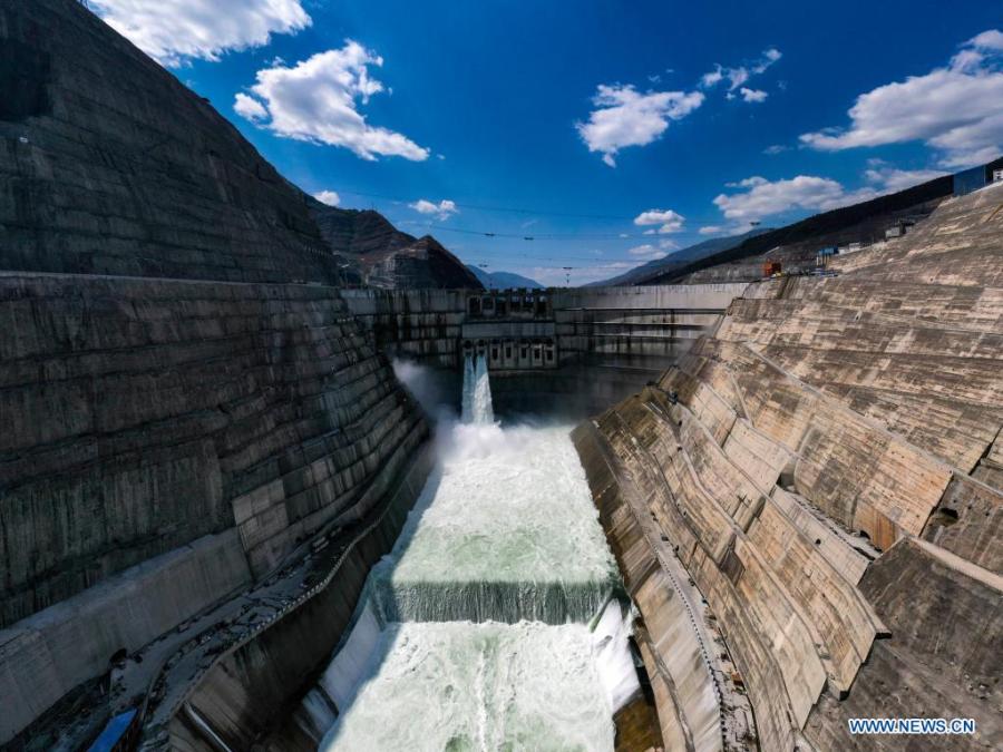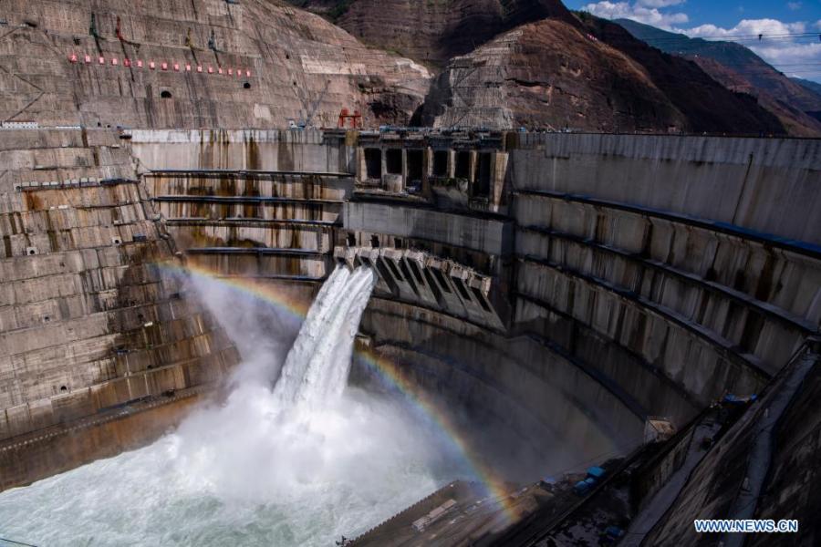 Aerial photo taken on May 13, 2021 shows the view of the Baihetan hydropower station under construction in southwest China. Baihetan on the Jinsha River, the upper section of the Yangtze, straddles the southwest provinces of Yunnan and Sichuan. With a total installed capacity of 16 million kilowatts, it is the second-largest hydropower station in China in terms of installed capacity, second only to the Three Gorges Dam project in the central province of Hubei. The first batch of Baihetan's generating units will go into operation in July 2021, and all units are expected to be operational by July 2022. (Xinhua/Jiang Wenyao)