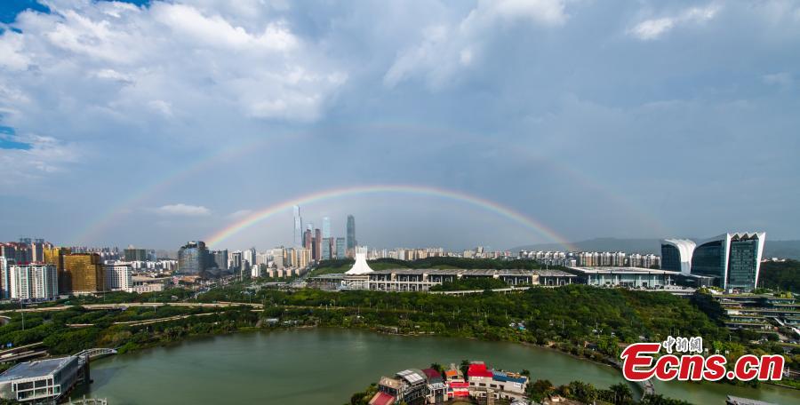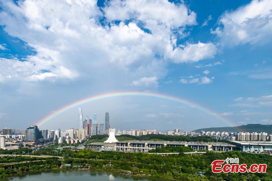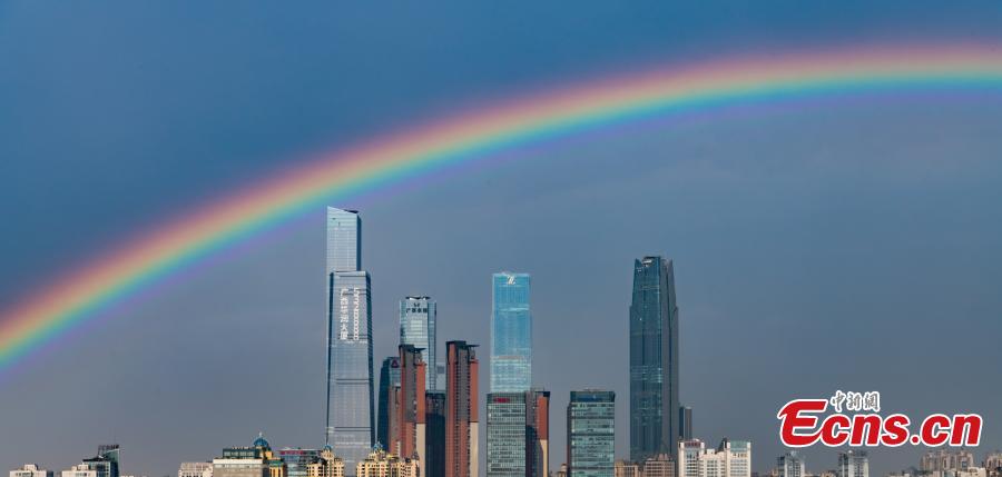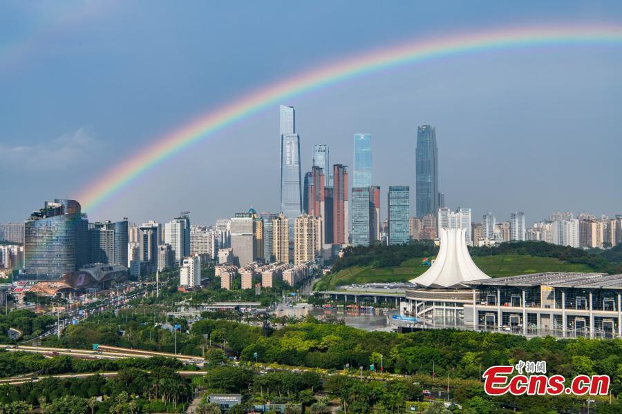 A beautiful rainbow landscape appears after a heavy rain in Nanning, Guangxi, May 16, 2021. (Photo /Huang Weiming)