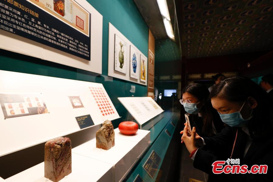 An exhibition on stamps featuring ancient architecture and cultural relics from the Palace Museum opened at the museum Monday. This is the first culture-themed exhibition co-held by the Palace Museum and China Post. The highlight of the exhibition is that "stamps and cultural relics are framed together, reflecting history and times". A total of 1,732 stamps in 56 sets are on display at the exhibition, along with 25 cultural relics from the museum, including works of calligraphy art, paintings, jade ware, enamel vessels, bronze ware and porcelains.