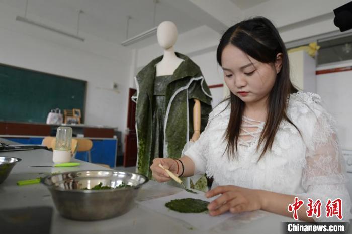 Photo taken on May 28, 2021 shows the edible clothes made by Tang Danyang, a college student from Changchun, NE China's Jilin Province. Fibers extracted from spinach are combined with edible material like syrup to obtain cloth suitable for clothes. Edible clothes, degradable and environmentally friendly, can consume stale vegetables and fruits. (Photo: China News Service/Zhang Yao)