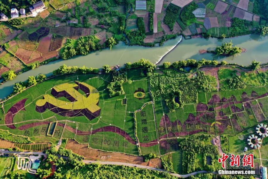 Aerial photo shows the landscape of colorful paddy fields in Yangshuo County, Guilin City, Guangxi Zhuang Autonomous Region. Paddy fields, mountains and rivers together form a magnificent landscape. (Photo: China News Service/Liu Jun)
