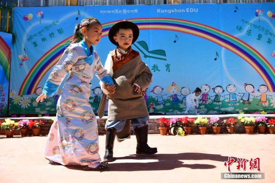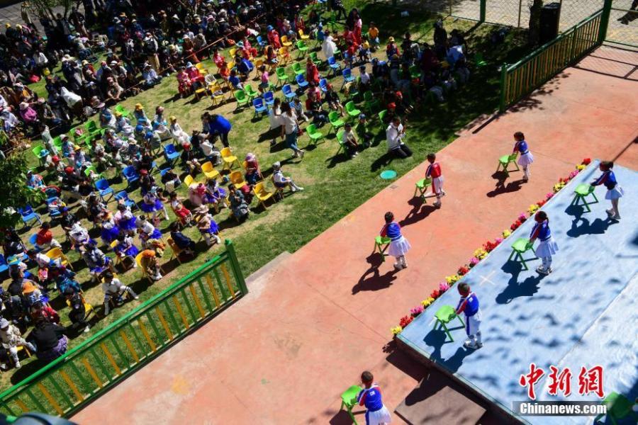Photo taken on Jun 1 shows children perform at an art show in a kindergarten in Lhasa on Children's Day. Various activities including art shows and games have been held in kindergartens and primary schools in Lhasa to celebrate Children's Day. (Photo/ China News Service).