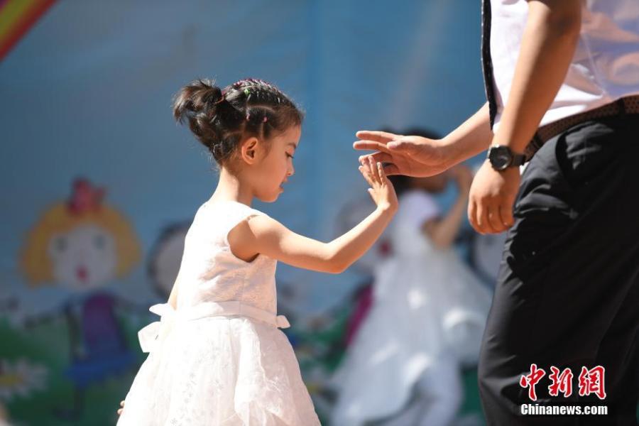 Photo taken on Jun 1 shows parent-child dance on Children's Day in a kindergarten in Lhasa. Various activities including art shows and games have been held in kindergartens and primary schools in Lhasa to celebrate International Children's Day. (Photo/ China News Service).