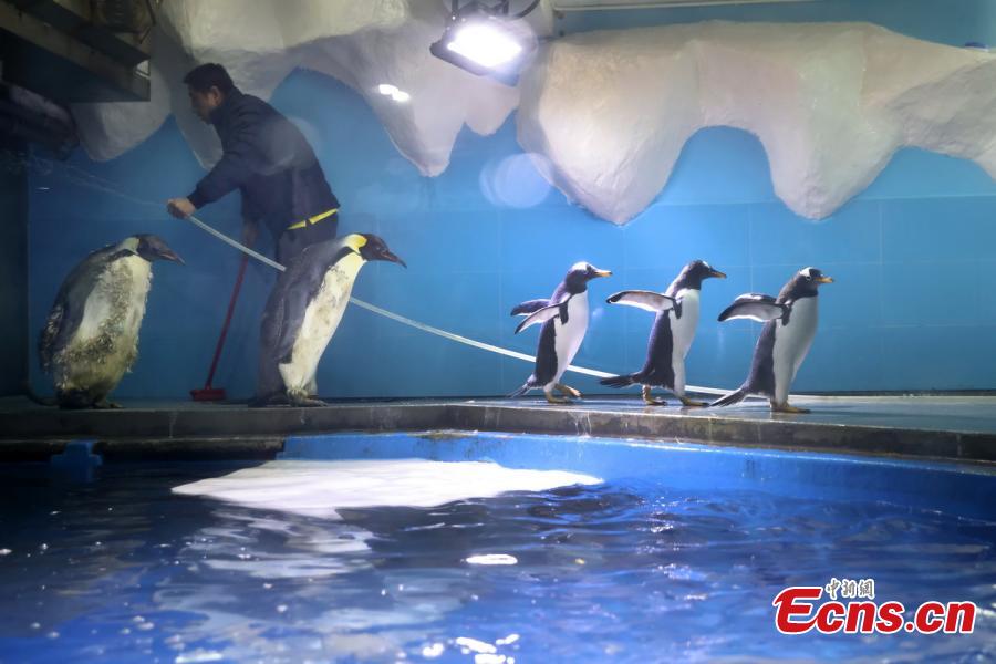 A breeder cleans the house of Gentoo penguins at the Nanjing Underwater World, Nanjing, Jiangsu, June 7, 2021. (Photo/Yang Bo)