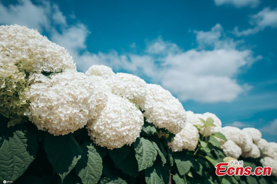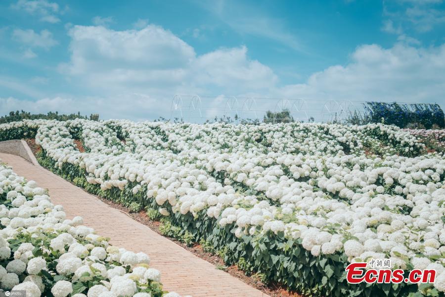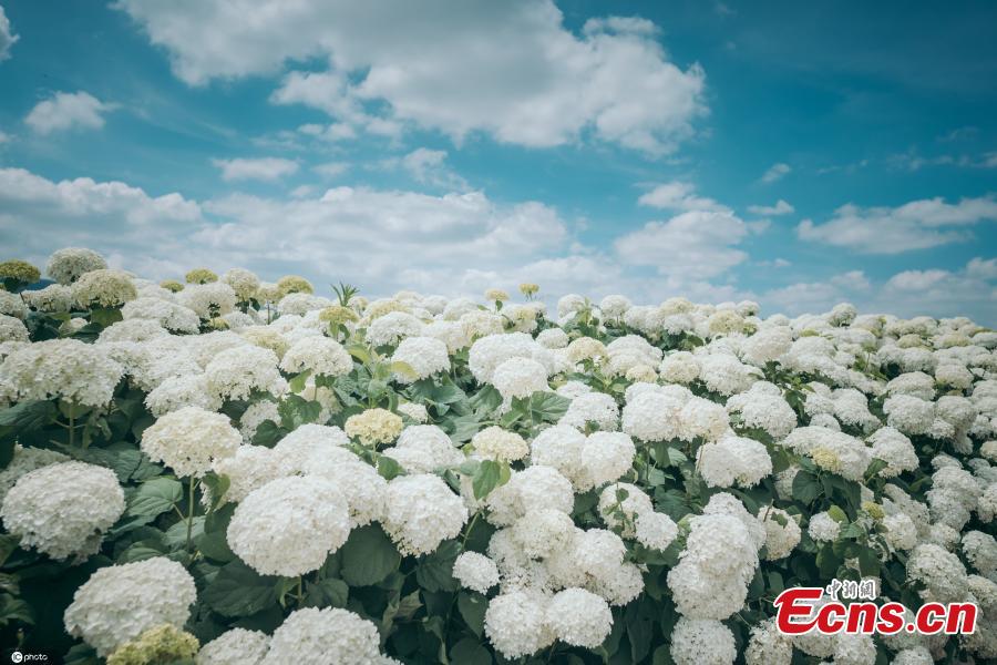 This undated photo shows south China mountain flower hydrangea blooms in Yiliang County, Kunming City, Yunnan Province in early summer, creating a charming field of flowers. (Photo/IC)