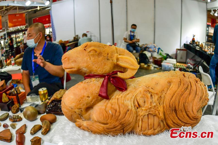 A roasted-lamb shaped stone is on display at a stone exhibition on June 16, 2021. The 13th Xinjiang Ornamental Stone and the Hotan Jade Selected Exposition was held at Xinjiang International Convention and Exhibition Center in China's Xinjiang Uygur Autonomous Region. (Photo/ China News Service: Liu Xin)