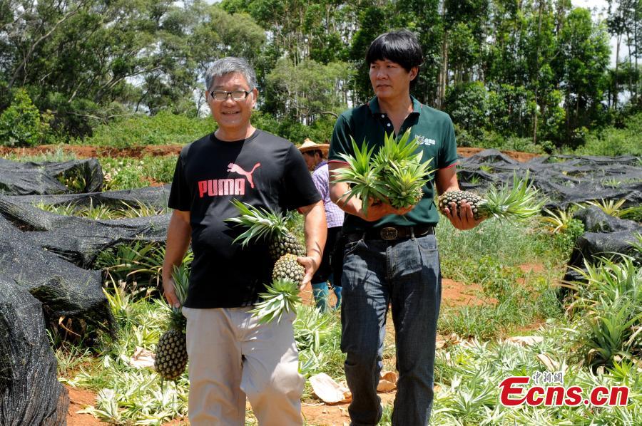 Taiwanese farmer Zeng Yingxuan shows the pineapples he has planted in Huxi Township, Zhangzhou City, Fujian Province, July 10, 2021. (Photo/Zhang Jinchuan)