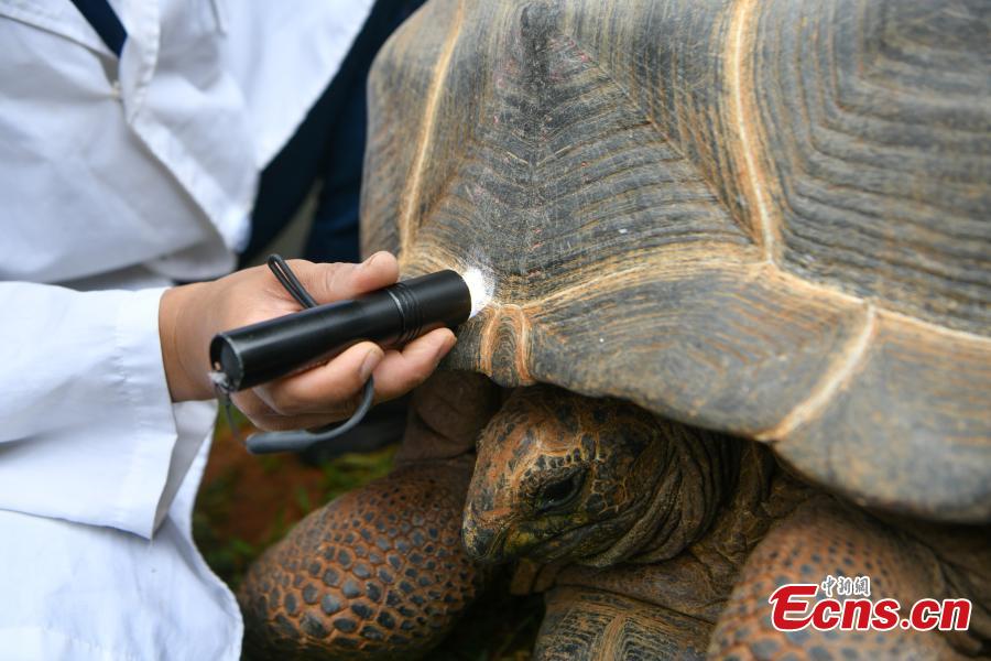 A veterinarian observes the cracks in the Aldabra giant tortoise's shell at Yunnan Wildlife Park in Kunming, Yunnan, July 13, 2021. (Photo: China News Service/Liu Ranyang)
