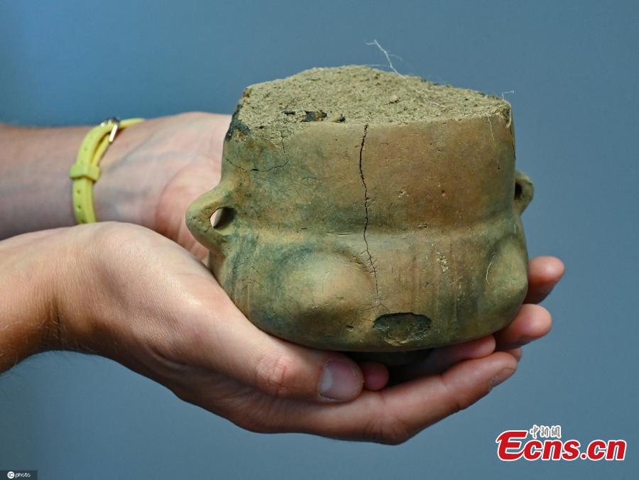 A member of staff from the Institute for Applied Cultural Studies Elisabeth Ida Faulstich-Schilling shows a clay vessel found during excavations in Guben, July 13, 2021. (Photo/IC)