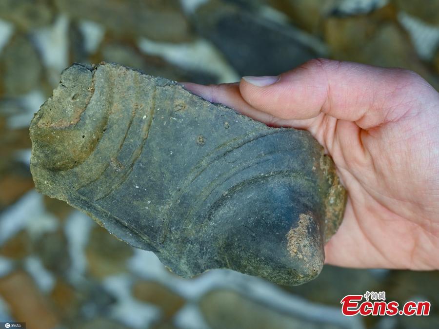 A member of staff from the Institute for Applied Cultural Studies Elisabeth Ida Faulstich-Schilling shows a clay shard from a vessel found during excavations in Guben, July 13, 2021. (Photo/IC)