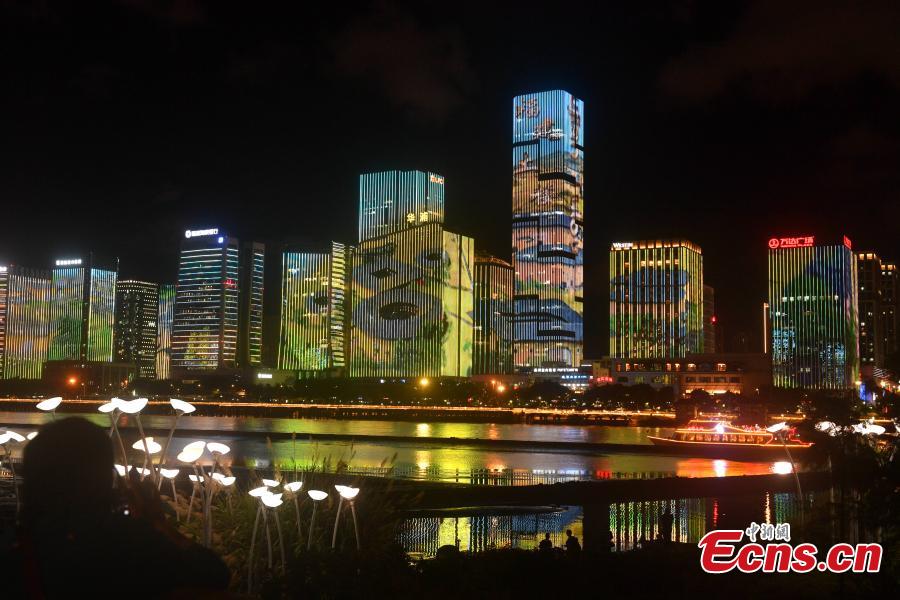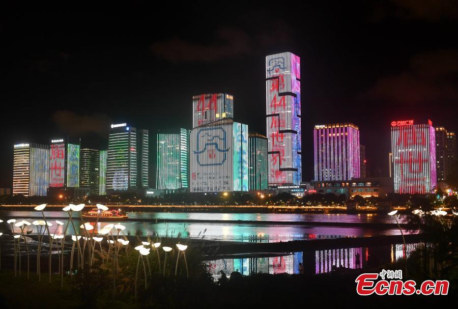 This photo shows a light show is played on the facades of buildings in Fuzhou, Fujian Province, July 15, 2021. (Photo/Lyu Ming)