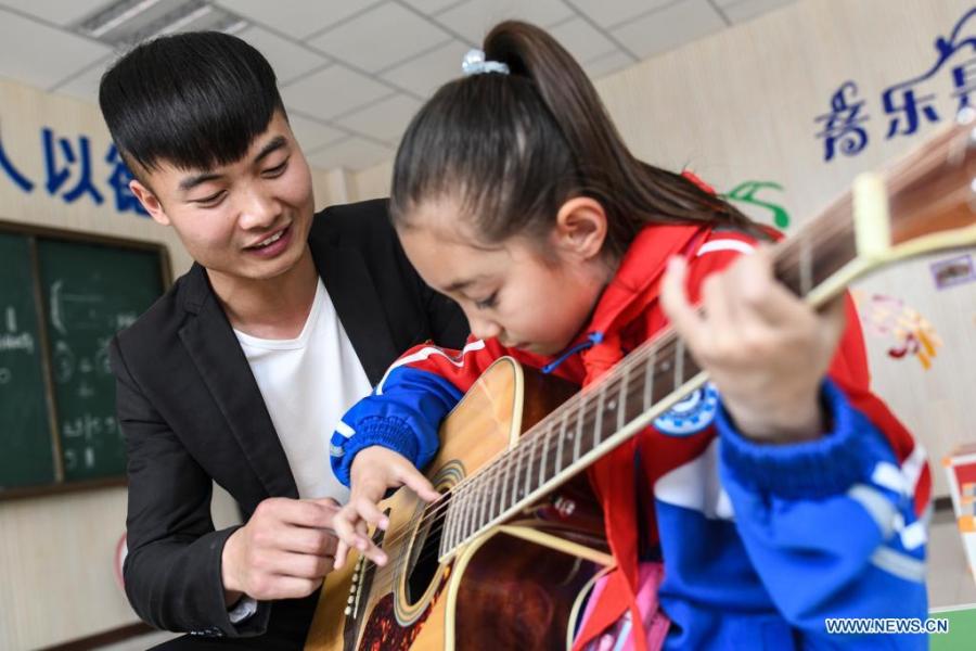 Volunteer teacher Shi Xinglin instructs as a student learns to play the guitar at a primary school in Qiemo County, northwest China's Xinjiang Uygur Autonomous Region, April 18, 2019. Xinjiang Uygur Autonomous Region in northwest China sets great store by the preservation of cultural treasures. (Xinhua/Wang Fei)