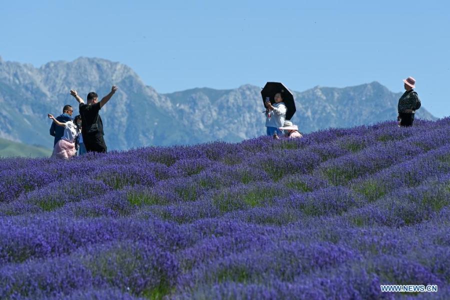 Visitors play in a lavender farm in Huocheng County, northwest China's Xinjiang Uygur Autonomous Region, June 13, 2021. Xinjiang Uygur Autonomous Region in northwest China sets great store by the preservation of cultural treasures. (Xinhua/Ding Lei)