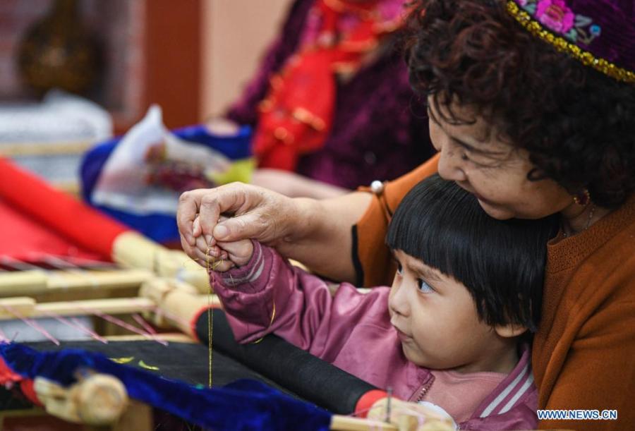 An embroiderer learns embroidery techniques with her granddaughter at a workshop in Yizhou District of Hami, northwest China's Xinjiang Uygur Autonomous Region, March 19, 2021. Xinjiang Uygur Autonomous Region in northwest China sets great store by the preservation of cultural treasures. (Xinhua/Wang Fei)
