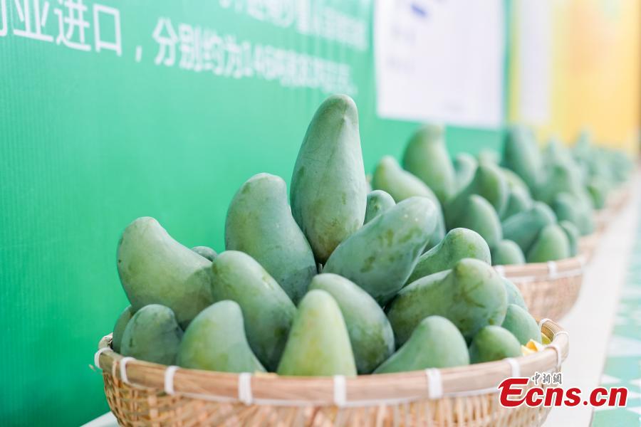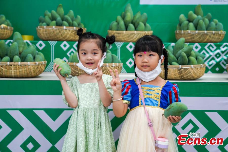 An exhibition to celebrate the harvest of mango is held at the Tiandong Sports Center in Baise, Guangxi Zhuang autonomous region on July 18, 2021. More than 30 mango varieties were displayed at the exhibition on Sunday. (Photo/ Chen Guanyan)