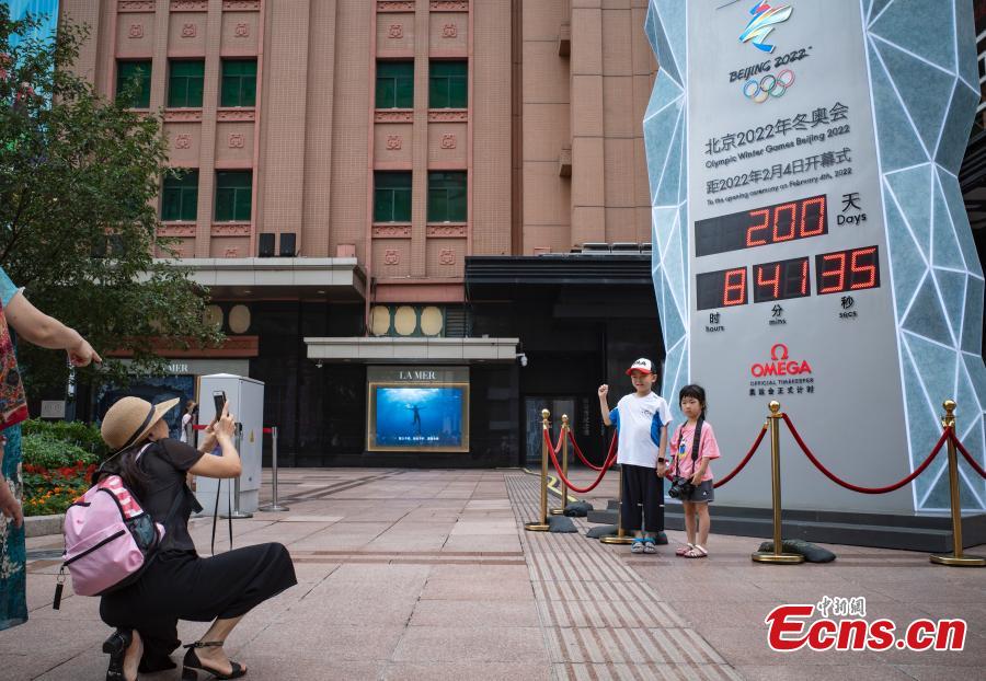 Children post for pictures before the countdown clock showing 200 days to go till the opening ceremony of the 2022 Olympic Winter Games at the Wangfujing street, in Beijing, China, July 19, 2021. (Photo: China News Service/ Hou Yu)