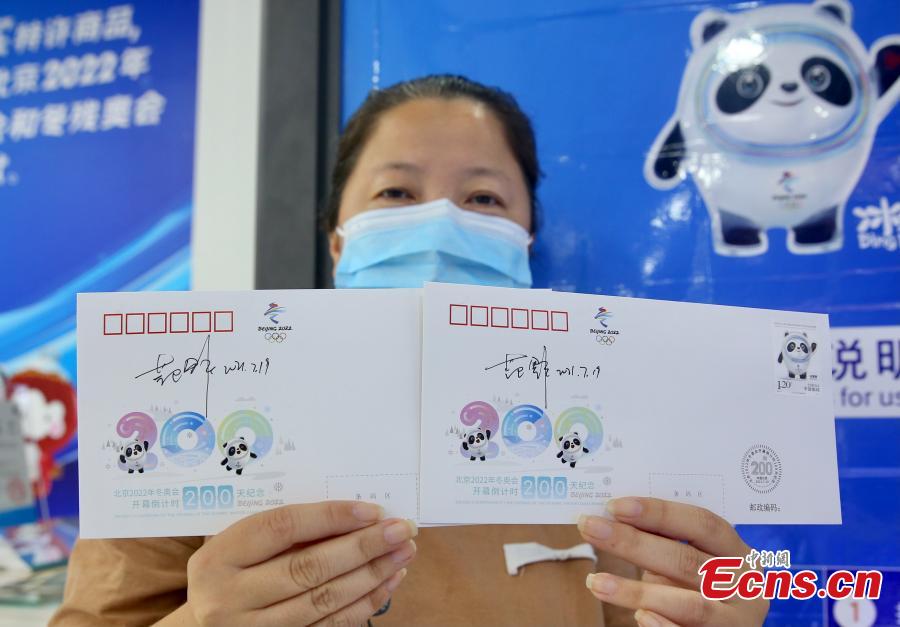 A philatelist presents commemorative envelopes with the designer's signature in the Arts and Crafts Mansion in the Wangfujing Street of Beijing, capital of China, July 19, 2021. (Photo: China News Service/ Yi Haifei)